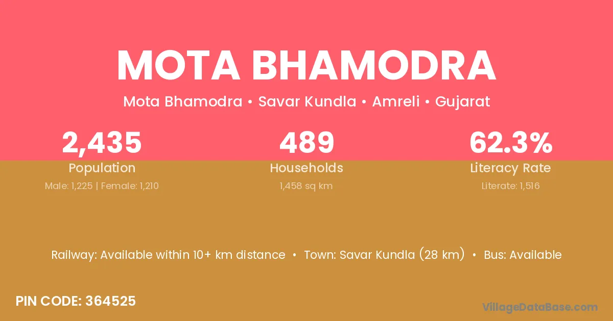 Mota Bhamodra village has a total population of 2,435 people, of which 1,225 are males and 1,210 are females.