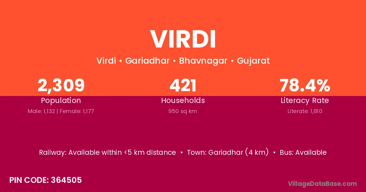Savar Kundla (34 km) is the nearest town to Virdi village for major economic activities and is located approximately 34 km away.