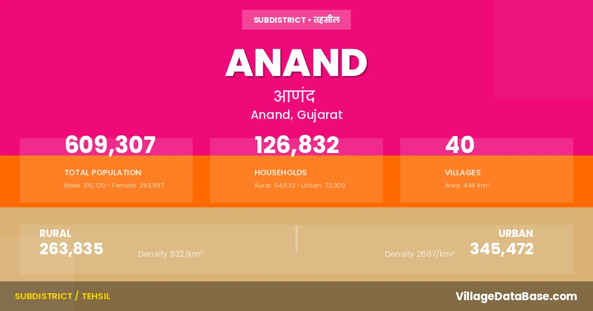 According to the 2011 census The total area of Anand Taluka is 446 km², with a population of 609307 people. The population density is 1,367 inhabitants per square kilometre, and there are approximately 126832 houses in the sub district.