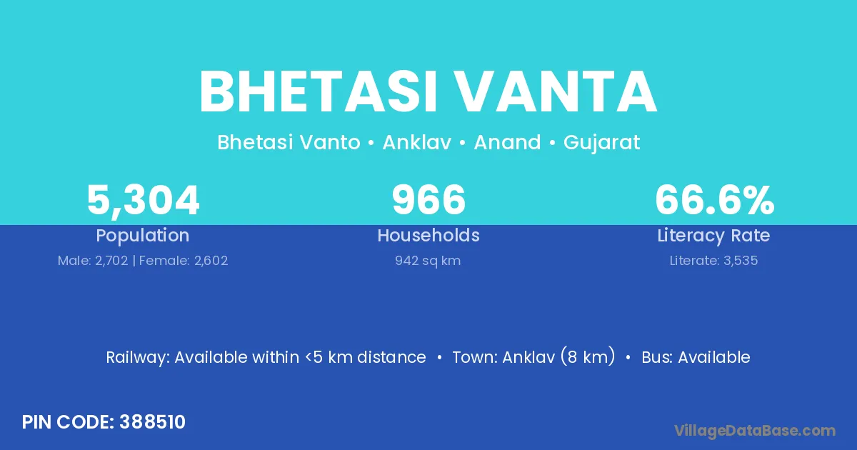Anklav (8 km) is the nearest town to Bhetasi Vanta village for major economic activities and is located approximately 8 km away.