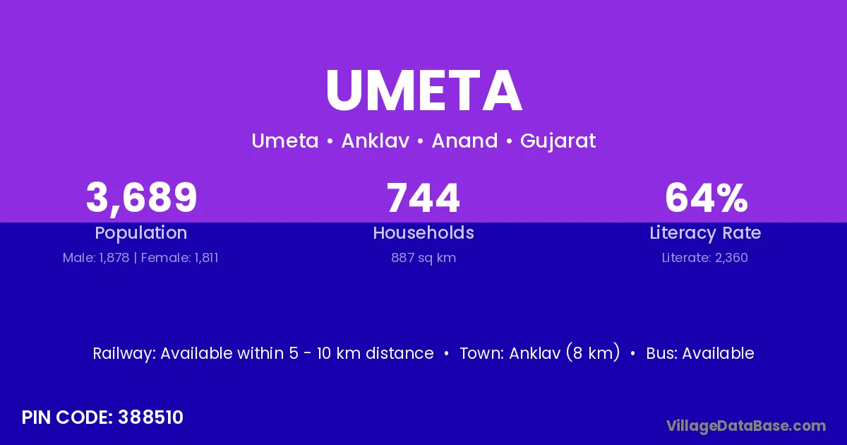 Anklav (8 km) is the nearest town to Umeta village for major economic activities and is located approximately 8 km away.