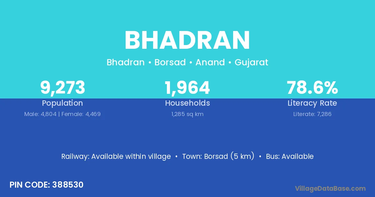 Borsad (5 km) is the nearest town to Bhadran village for major economic activities and is located approximately 5 km away.