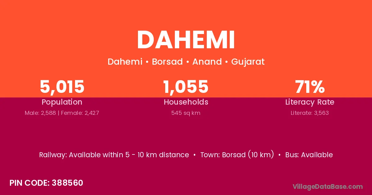 Borsad (10 km) is the nearest town to Dahemi village for major economic activities and is located approximately 10 km away.