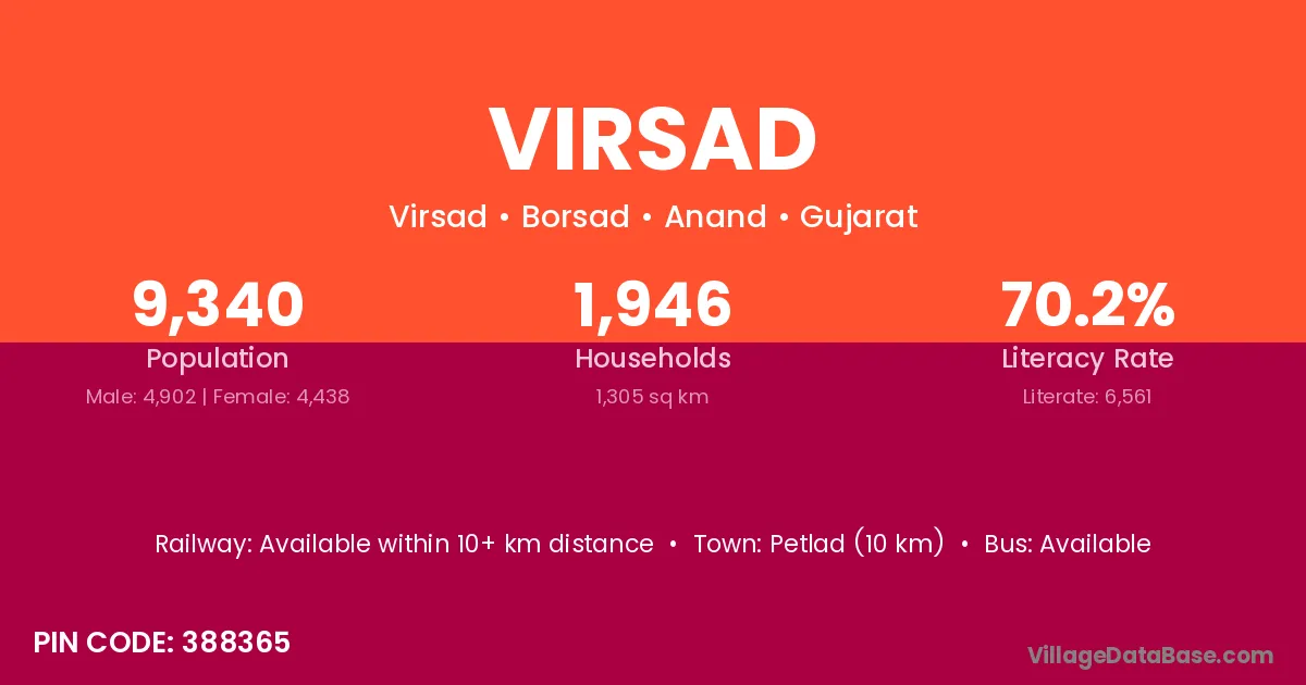 Petlad (10 km) is the nearest town to Virsad village for major economic activities and is located approximately 10 km away.