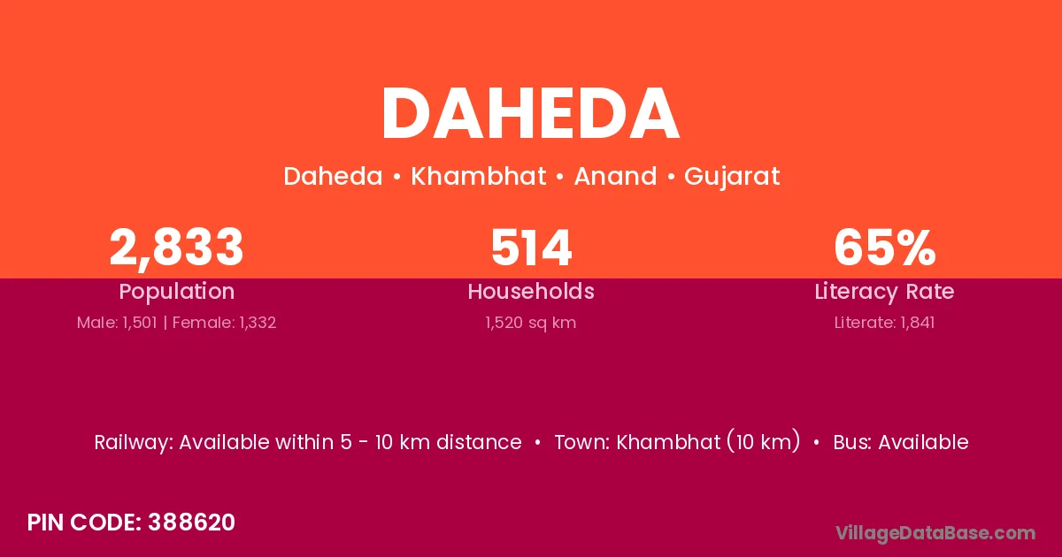 Khambhat (10 km) is the nearest town to Daheda village for major economic activities and is located approximately 10 km away.