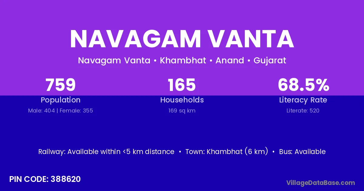 Khambhat (6 km) is the nearest town to Navagam Vanta village for major economic activities and is located approximately 6 km away.