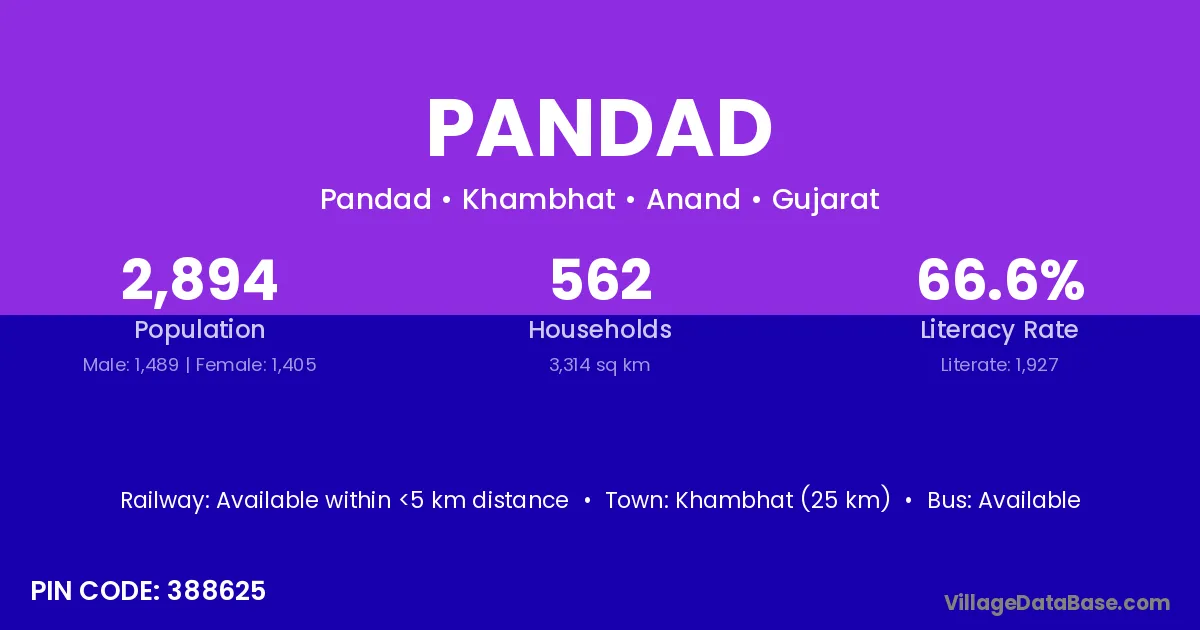 Khambhat (25 km) is the nearest town to Pandad village for major economic activities and is located approximately 25 km away.
