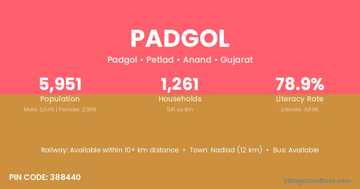 Nadiad (12 km) is the nearest town to Padgol village for major economic activities and is located approximately 12 km away.