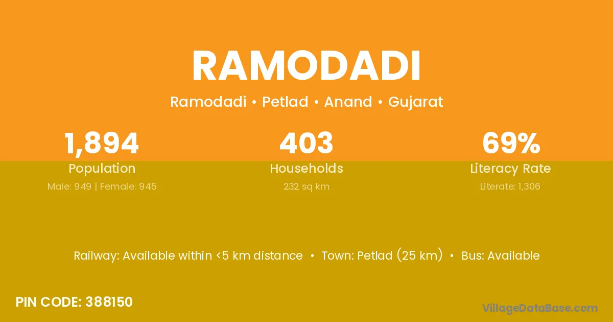 Petlad (25 km) is the nearest town to Ramodadi village for major economic activities and is located approximately 25 km away.