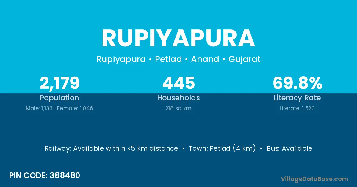 Petlad (4 km) is the nearest town to Rupiyapura village for major economic activities and is located approximately 4 km away.