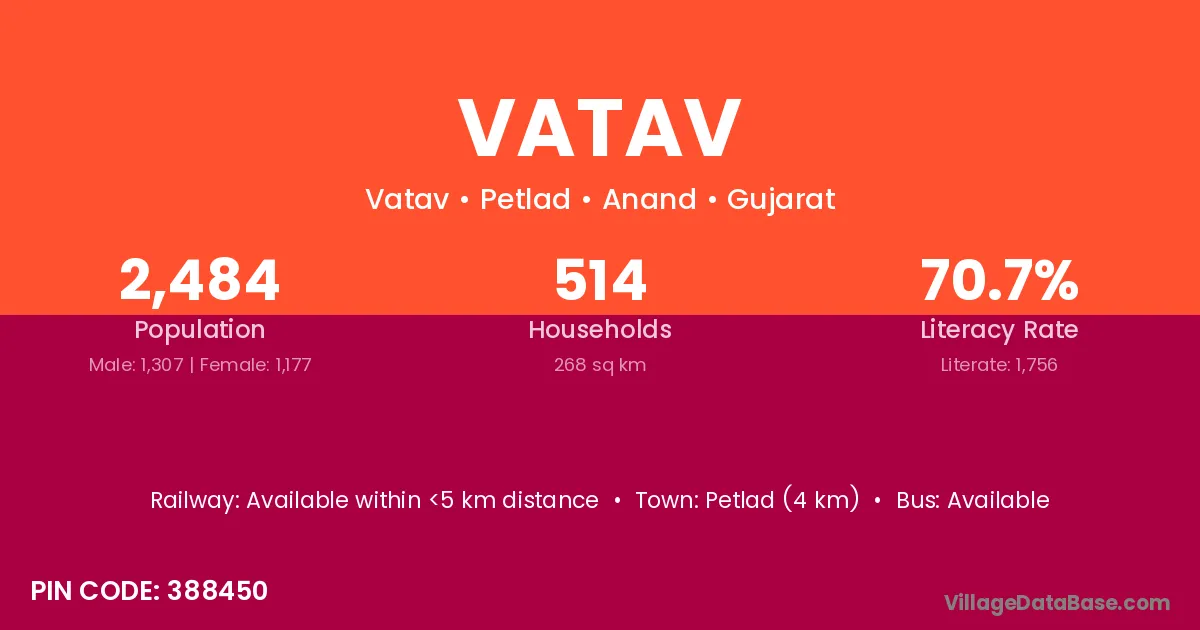 Petlad (4 km) is the nearest town to Vatav village for major economic activities and is located approximately 4 km away.
