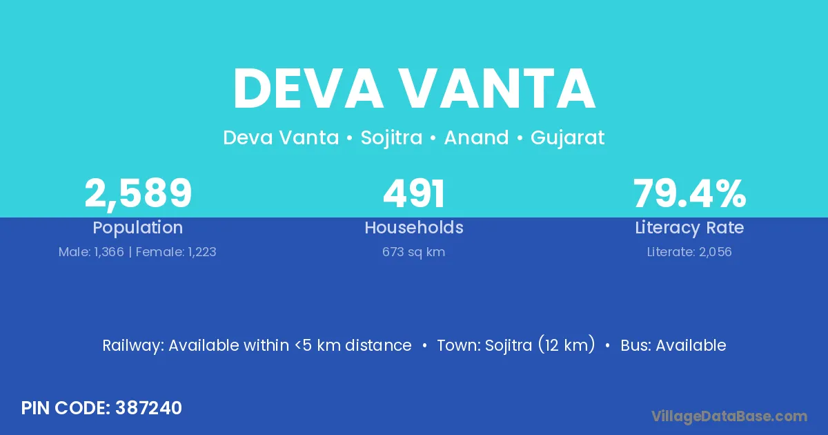 Sojitra (12 km) is the nearest town to Deva Vanta village for major economic activities and is located approximately 12 km away.