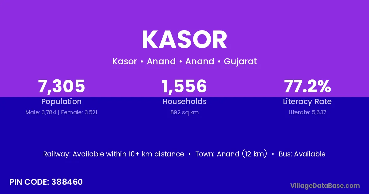 Sojitra (15 km) is the nearest town to Kasor village for major economic activities and is located approximately 15 km away.