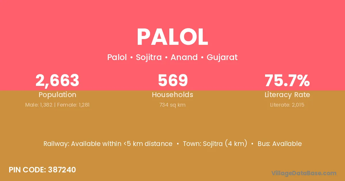 Sojitra (4 km) is the nearest town to Palol village for major economic activities and is located approximately 4 km away.