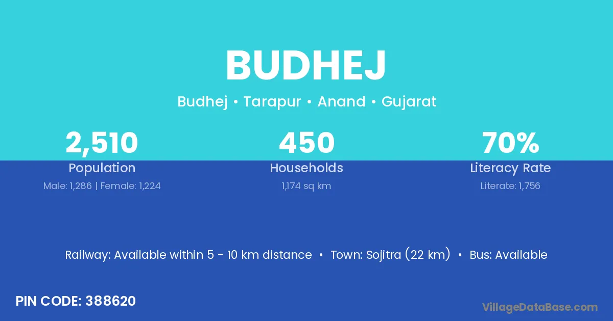 Sojitra (22 km) is the nearest town to Budhej village for major economic activities and is located approximately 22 km away.