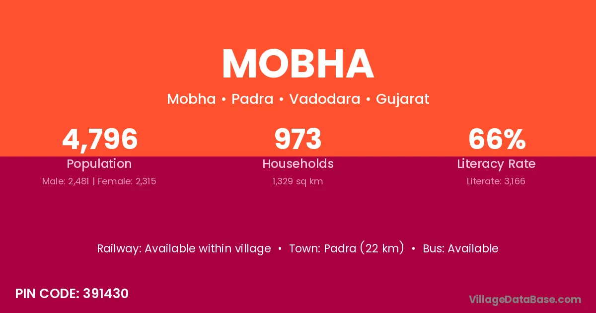 Sojitra (22 km) is the nearest town to Mobha village for major economic activities and is located approximately 22 km away.