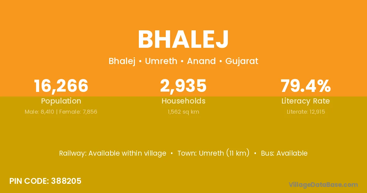 Umreth (11 km) is the nearest town to Bhalej village for major economic activities and is located approximately 11 km away.
