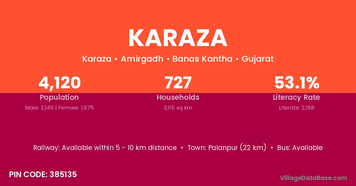 Palanpur (22 km) is the nearest town to Karaza village for major economic activities and is located approximately 22 km away.