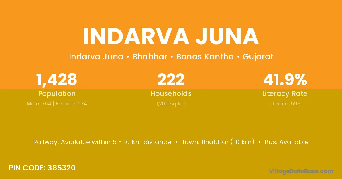 Bhabhar (10 km) is the nearest town to Indarva Juna village for major economic activities and is located approximately 10 km away.
