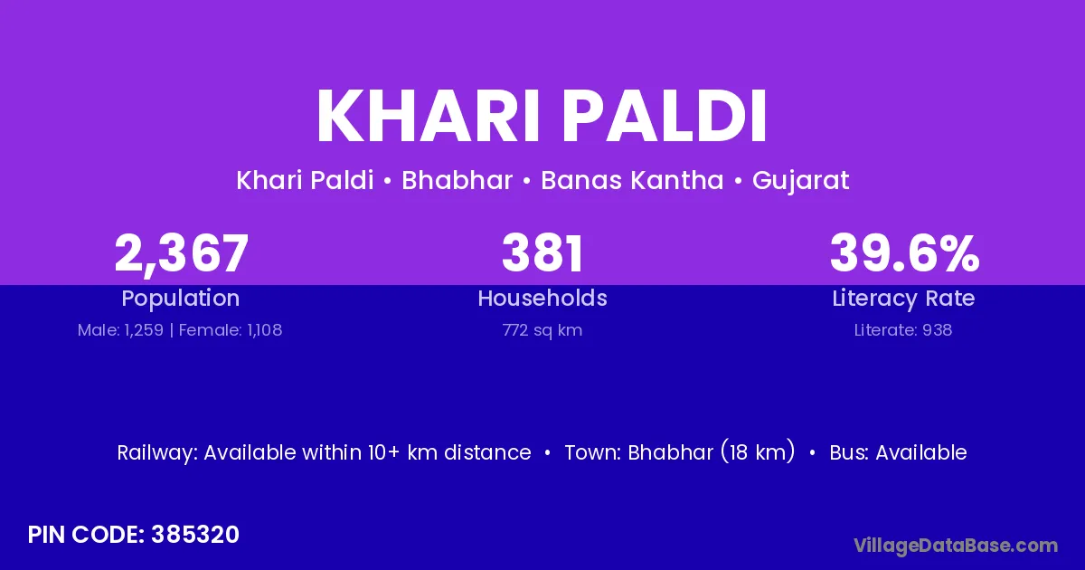 Bhabhar (18 km) is the nearest town to Khari Paldi village for major economic activities and is located approximately 18 km away.