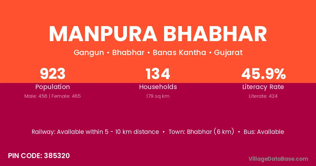 Manpura Bhabhar village has a total population of 923 people, of which 458 are males and 465 are females.