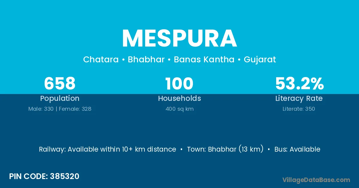 Bhabhar (13 km) is the nearest town to Mespura village for major economic activities and is located approximately 13 km away.