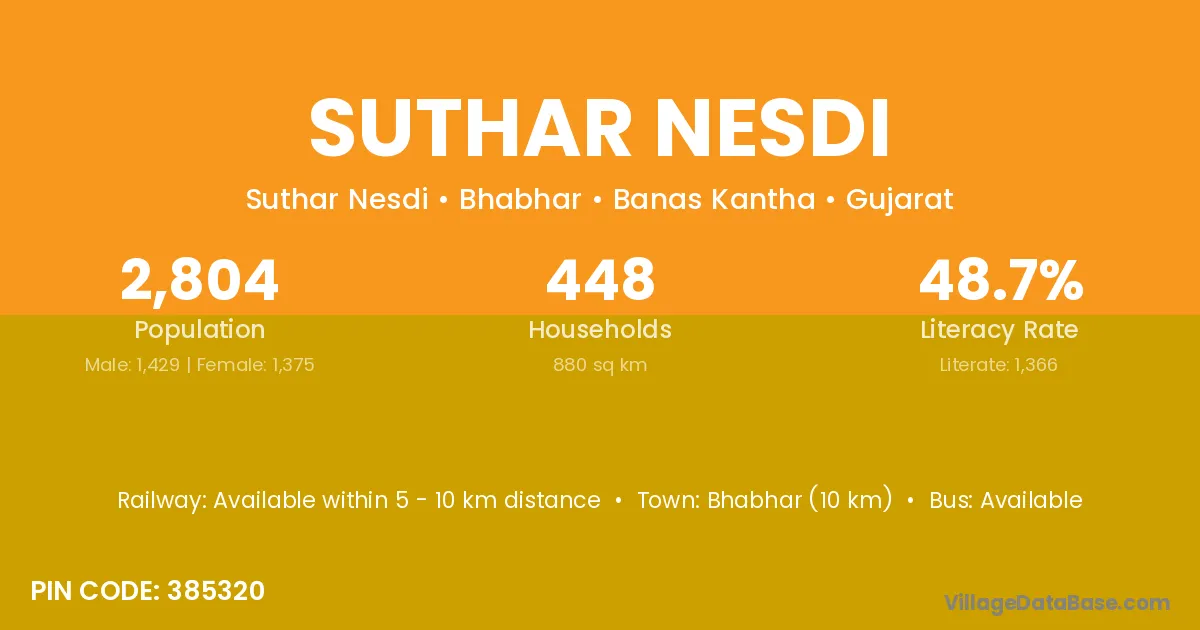Bhabhar (10 km) is the nearest town to Suthar Nesdi village for major economic activities and is located approximately 10 km away.