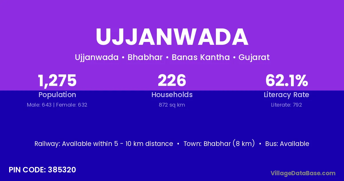 Bhabhar (8 km) is the nearest town to Ujjanwada village for major economic activities and is located approximately 8 km away.