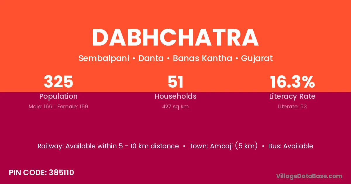 Ambaji (5 km) is the nearest town to Dabhchatra village for major economic activities and is located approximately 5 km away.