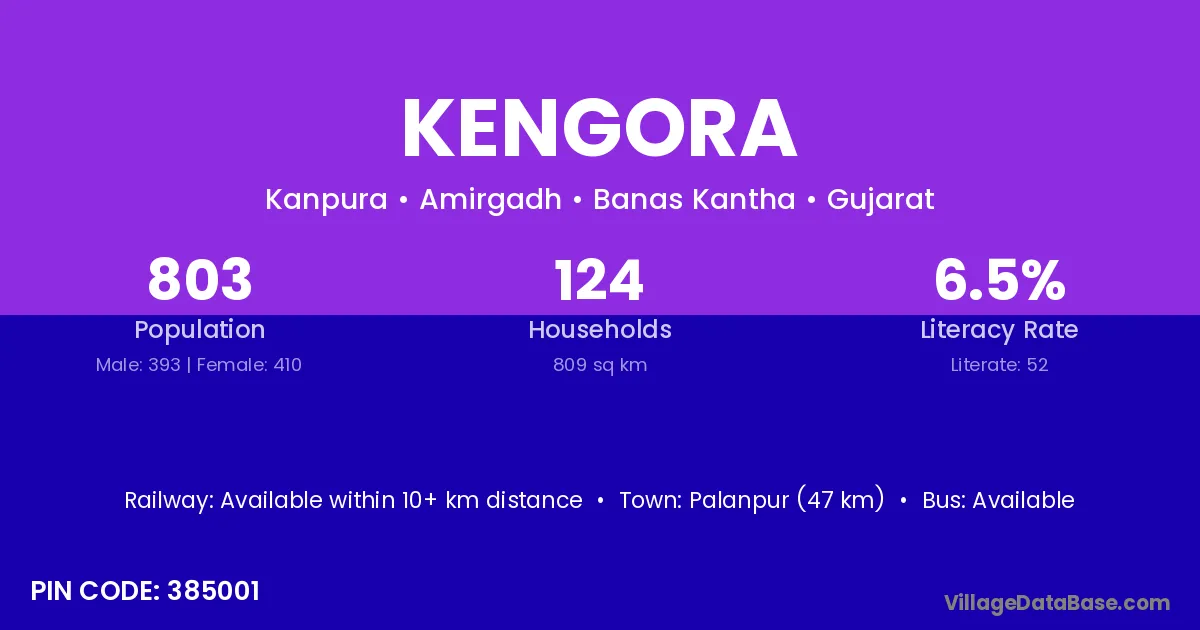 Ambaji (16 km) is the nearest town to Kengora village for major economic activities and is located approximately 16 km away.