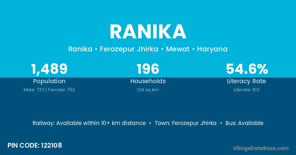 Ranika village has a total population of 1,162 people, of which 580 are males and 582 are females.
