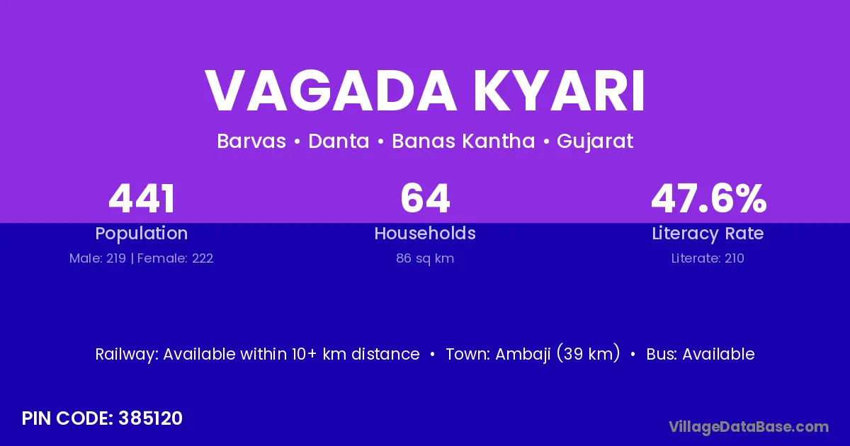 Ambaji (39 km) is the nearest town to Vagada Kyari village for major economic activities and is located approximately 39 km away.