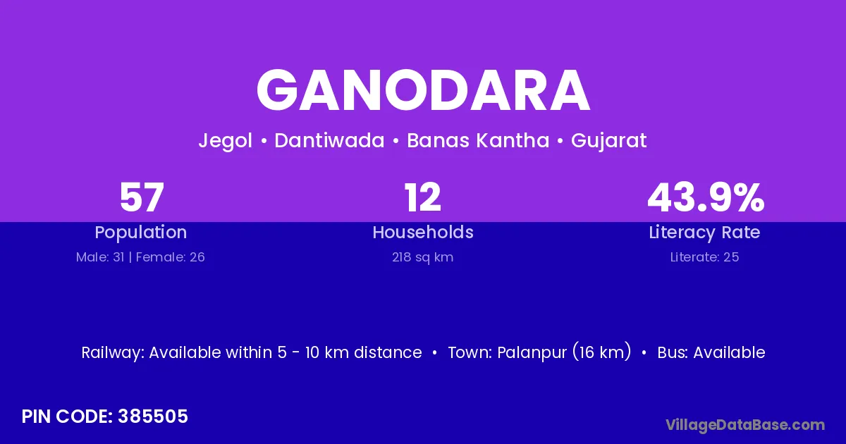 Palanpur (16 km) is the nearest town to Ganodara village for major economic activities and is located approximately 16 km away.