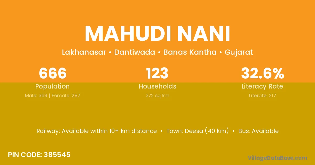 Deesa (40 km) is the nearest town to Mahudi Nani village for major economic activities and is located approximately 40 km away.