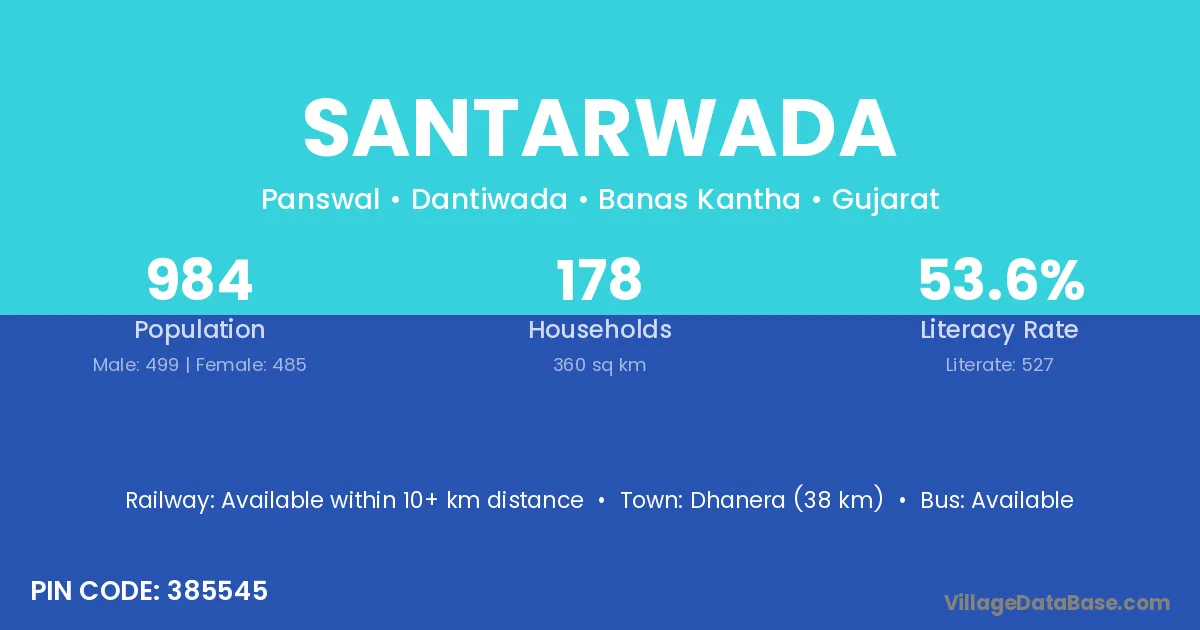 Dhanera (38 km) is the nearest town to Santarwada village for major economic activities and is located approximately 38 km away.