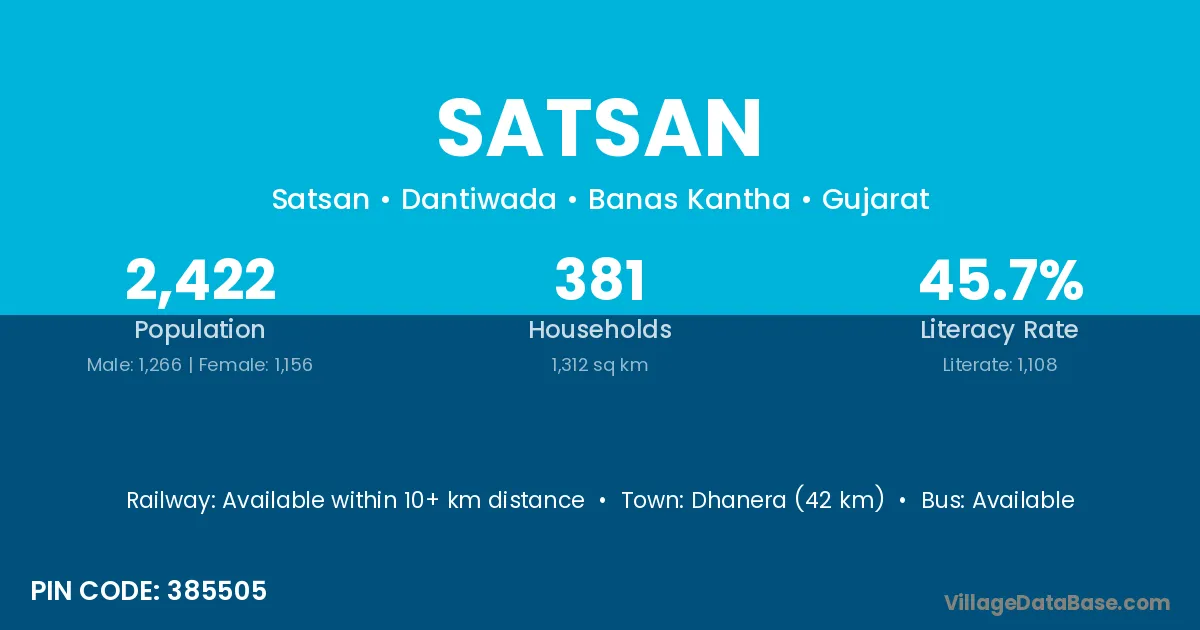 Dhanera (42 km) is the nearest town to Satsan village for major economic activities and is located approximately 42 km away.