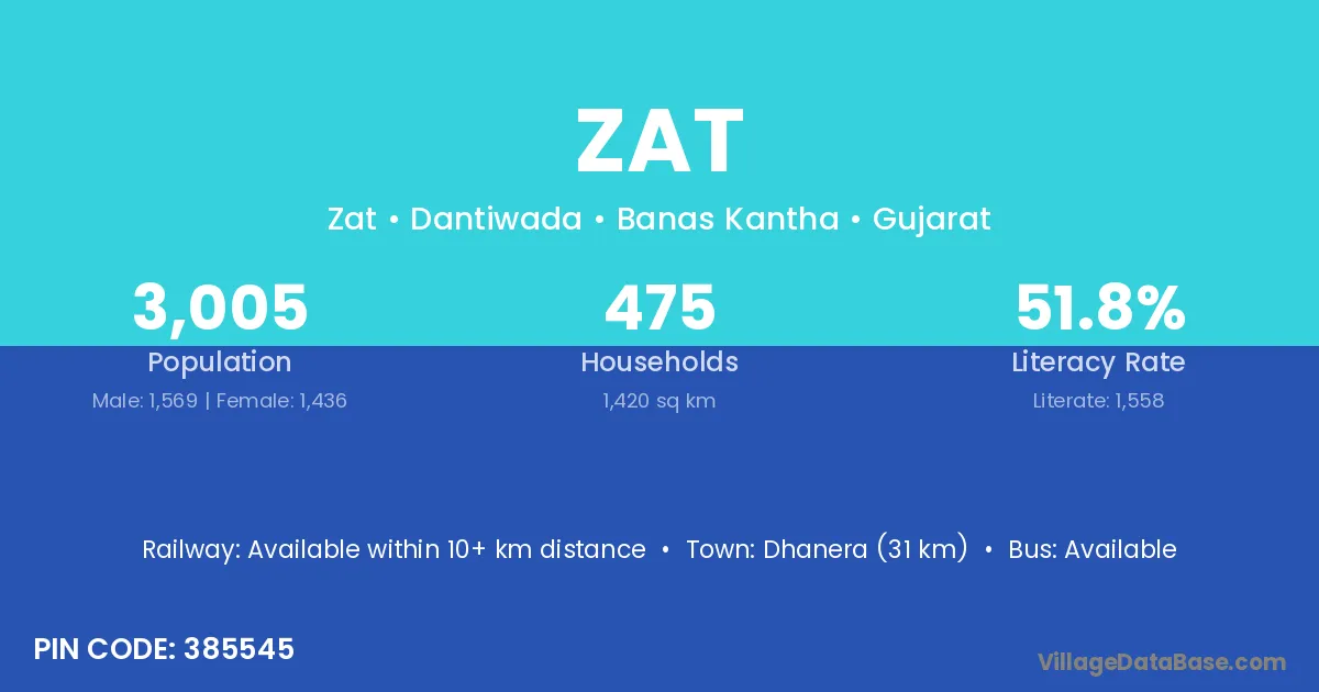 Dhanera (31 km) is the nearest town to Zat village for major economic activities and is located approximately 31 km away.