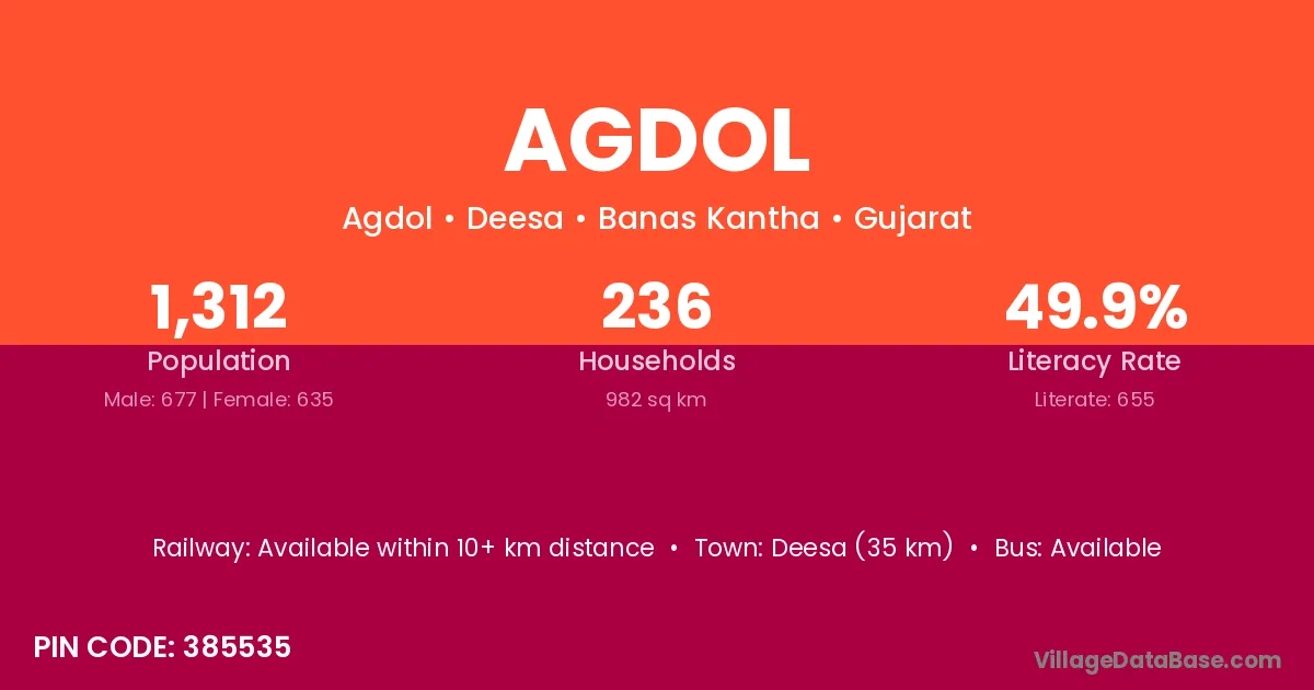 Deesa (35 km) is the nearest town to Agdol village for major economic activities and is located approximately 35 km away.