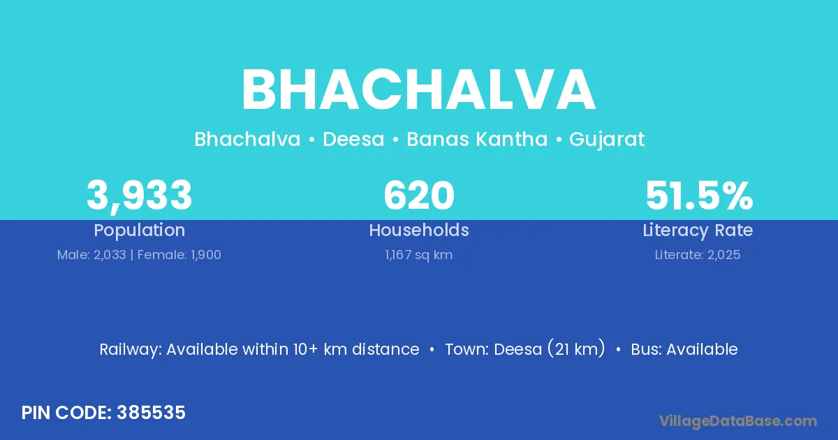 Deesa (21 km) is the nearest town to Bhachalva village for major economic activities and is located approximately 21 km away.