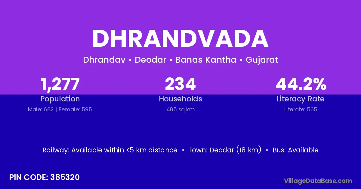 Deodar (18 km) is the nearest town to Dhrandvada village for major economic activities and is located approximately 18 km away.