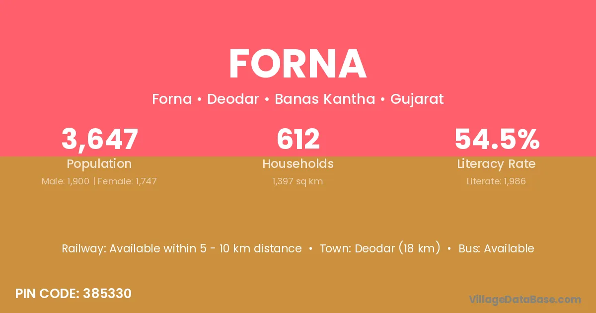Deodar (18 km) is the nearest town to Forna village for major economic activities and is located approximately 18 km away.