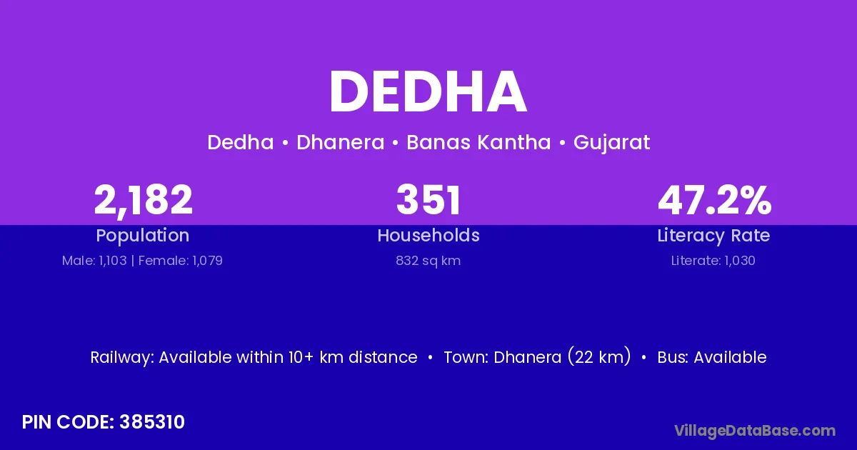 Dhanera (22 km) is the nearest town to Dedha village for major economic activities and is located approximately 22 km away.