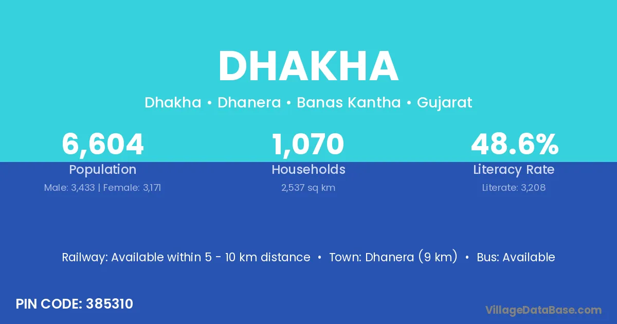 Dhanera (9 km) is the nearest town to Dhakha village for major economic activities and is located approximately 9 km away.