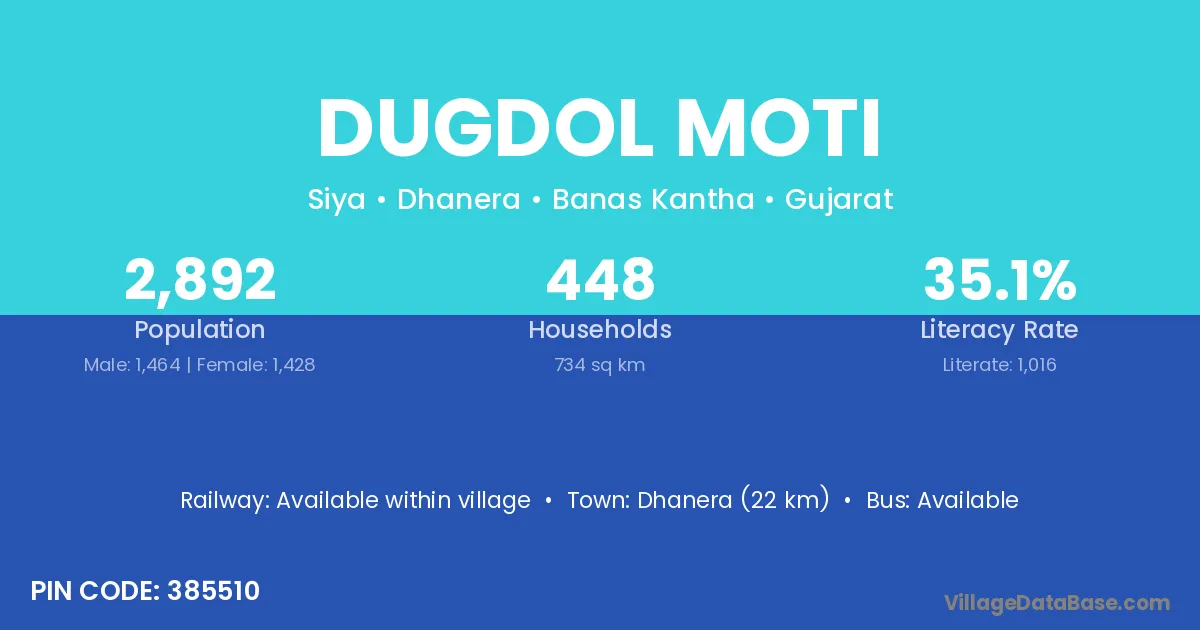 Dhanera (22 km) is the nearest town to Dugdol Moti village for major economic activities and is located approximately 22 km away.
