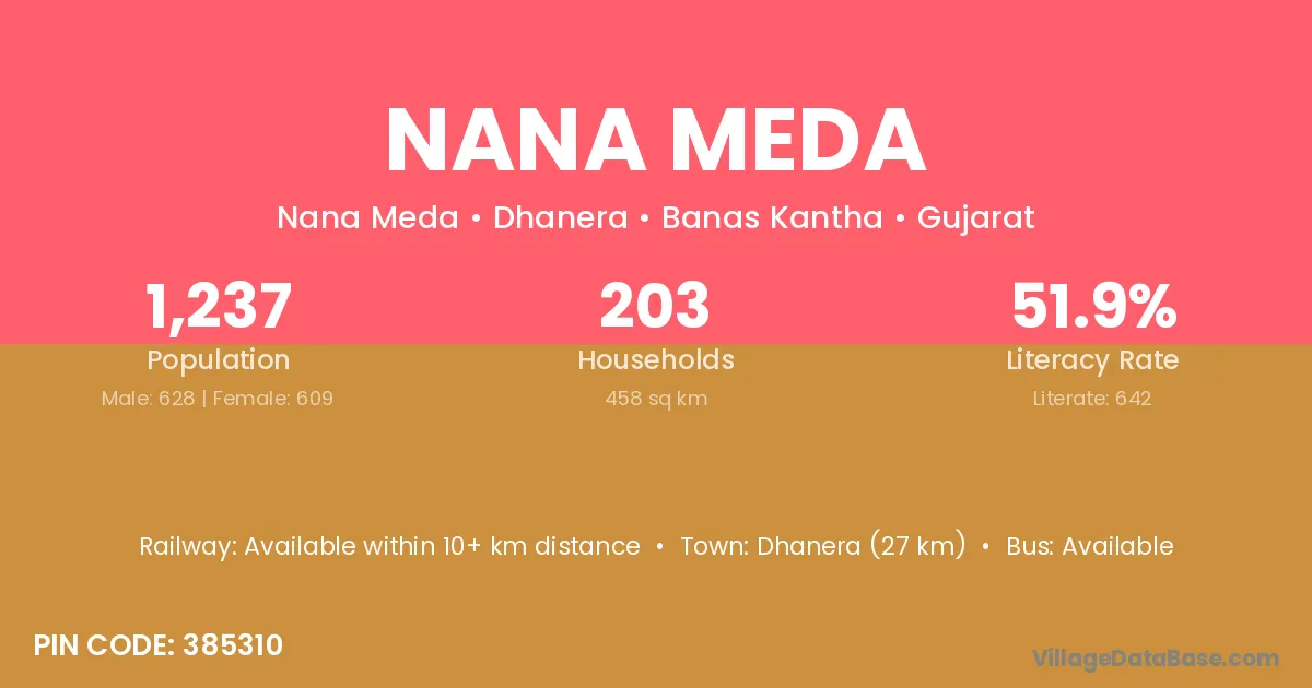 Dhanera (27 km) is the nearest town to Nana Meda village for major economic activities and is located approximately 27 km away.
