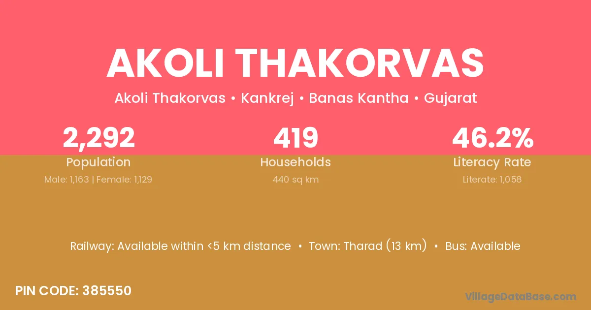Tharad (13 km) is the nearest town to Akoli Thakorvas village for major economic activities and is located approximately 13 km away.