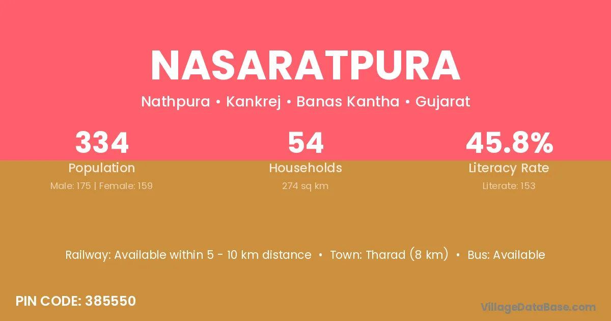 Tharad (8 km) is the nearest town to Nasaratpura village for major economic activities and is located approximately 8 km away.