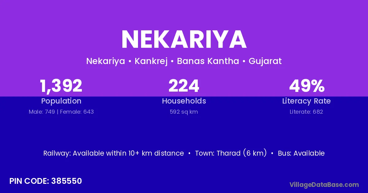 Tharad (6 km) is the nearest town to Nekariya village for major economic activities and is located approximately 6 km away.