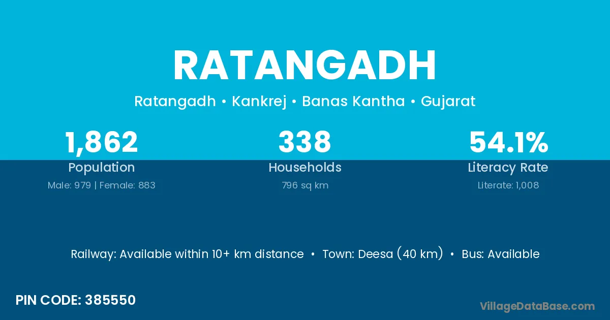 Deesa (40 km) is the nearest town to Ratangadh village for major economic activities and is located approximately 40 km away.