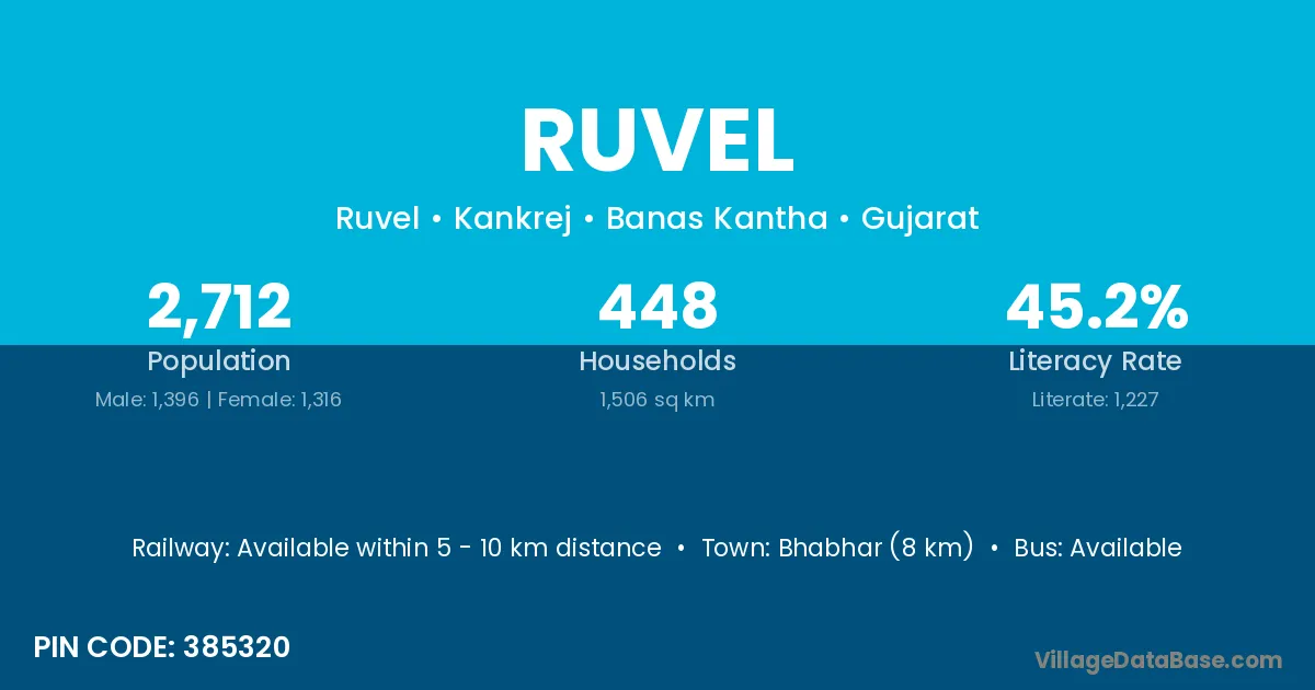 Bhabhar (8 km) is the nearest town to Ruvel village for major economic activities and is located approximately 8 km away.